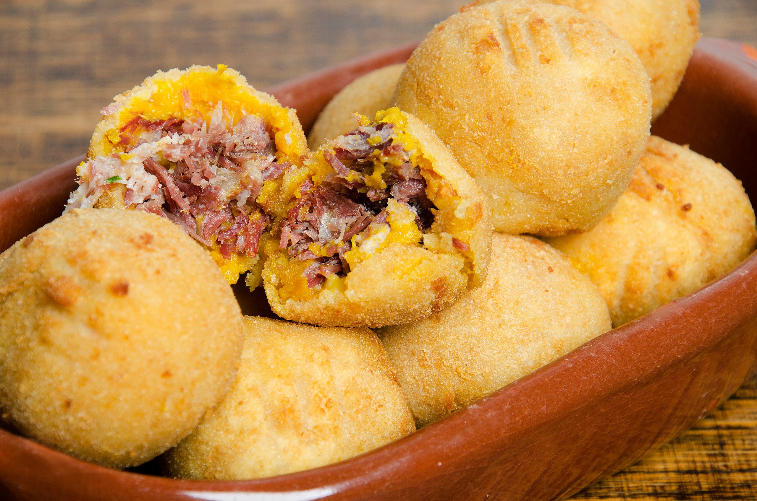 - Pegue uma pequena porção do purê, abra na palma das mão e adicione um pouco do recheio da carne seca, feche